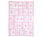Each panel reveals a different adventure of a spirited little girl: here she’s jumping rope, there she’s racing on a scooter, and elsewhere she’s dancing like a little star. All of it unfolds under the watchful eye of your child’s name, proudly appearing on several panels—next to the girl on the monkey bar —giving the blanket a truly unique and personal character.