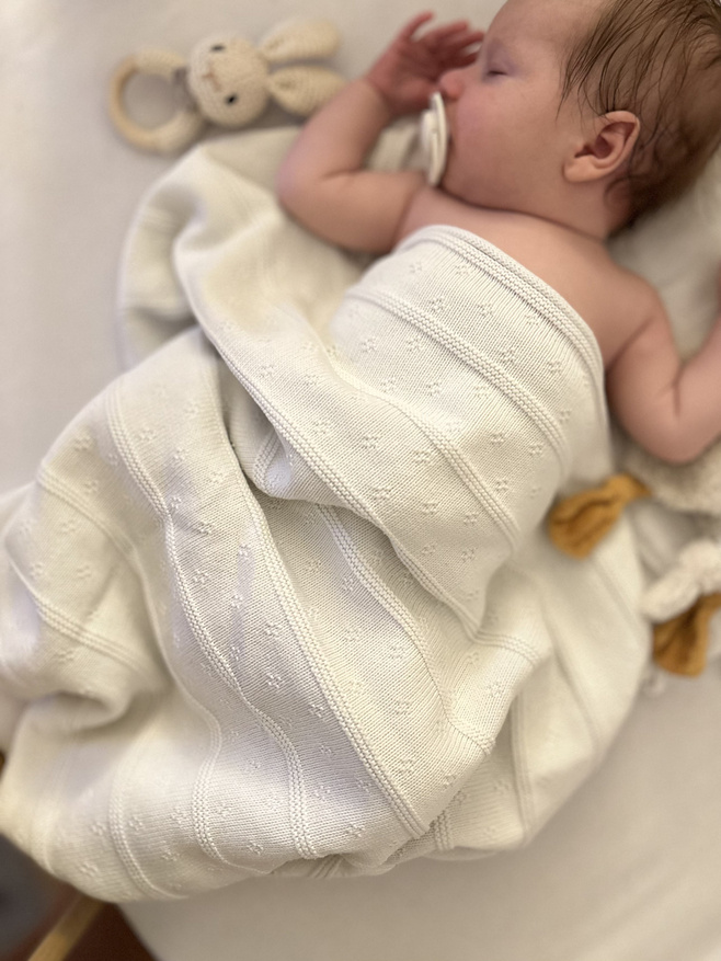 Our cotton baby blankets combine safety, natural materials, and timeless design. The patterns are not printed but created using a different color of yarn, which gives the blanket exceptional softness and durability.